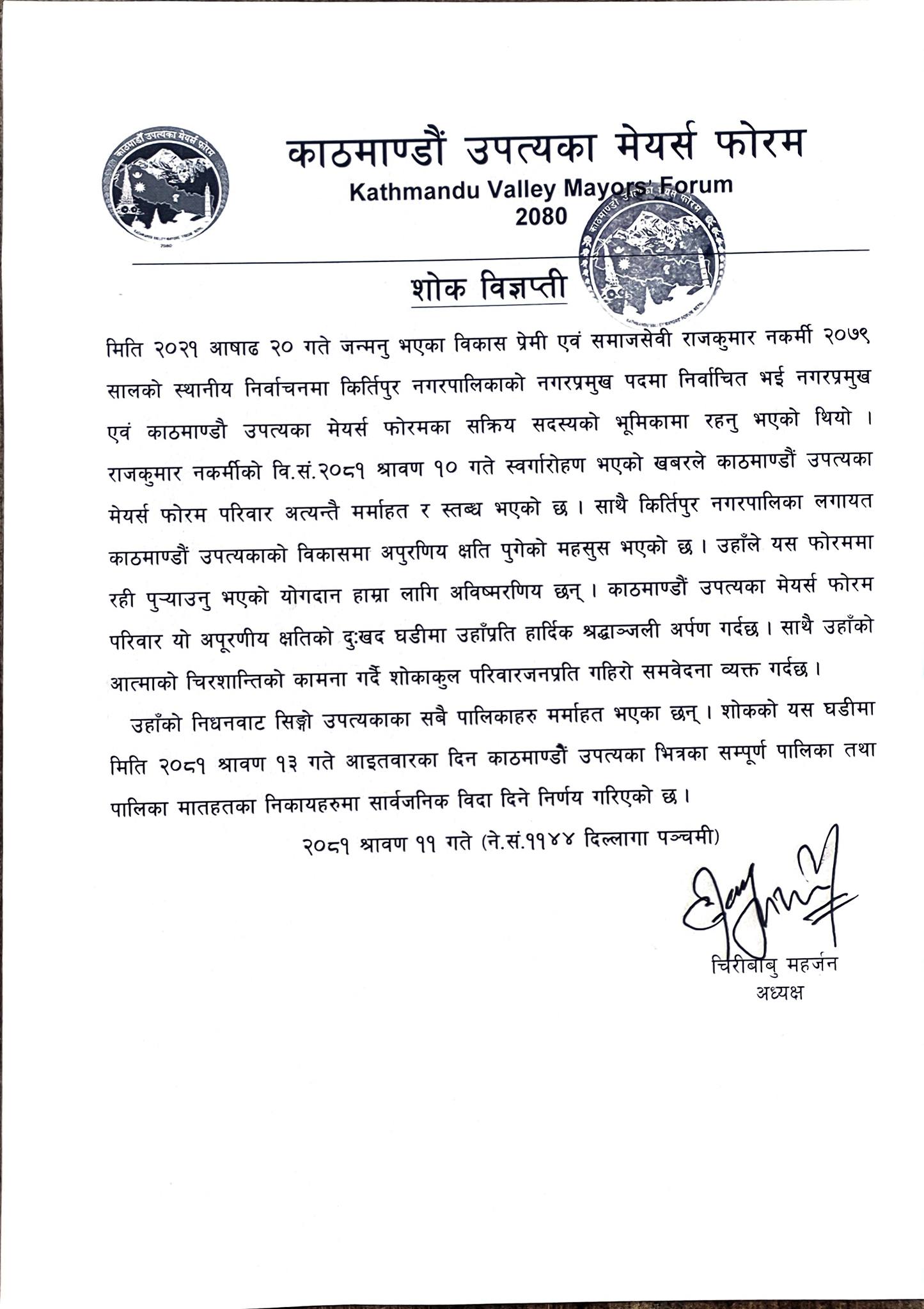 फोरमका अध्यक्ष चिरीबाबु महर्जनद्वारा जारी विज्ञप्तिमा कीर्तिपुर नगरपालिकाका मेयर राजकुमार नकर्मीको निधनको खबरले काठमाडौं उपत्यका मेयर्स फोरम परिवार अत्यन्तै मर्माहत र स्तब्ध भएको उल्लेख छ ।
