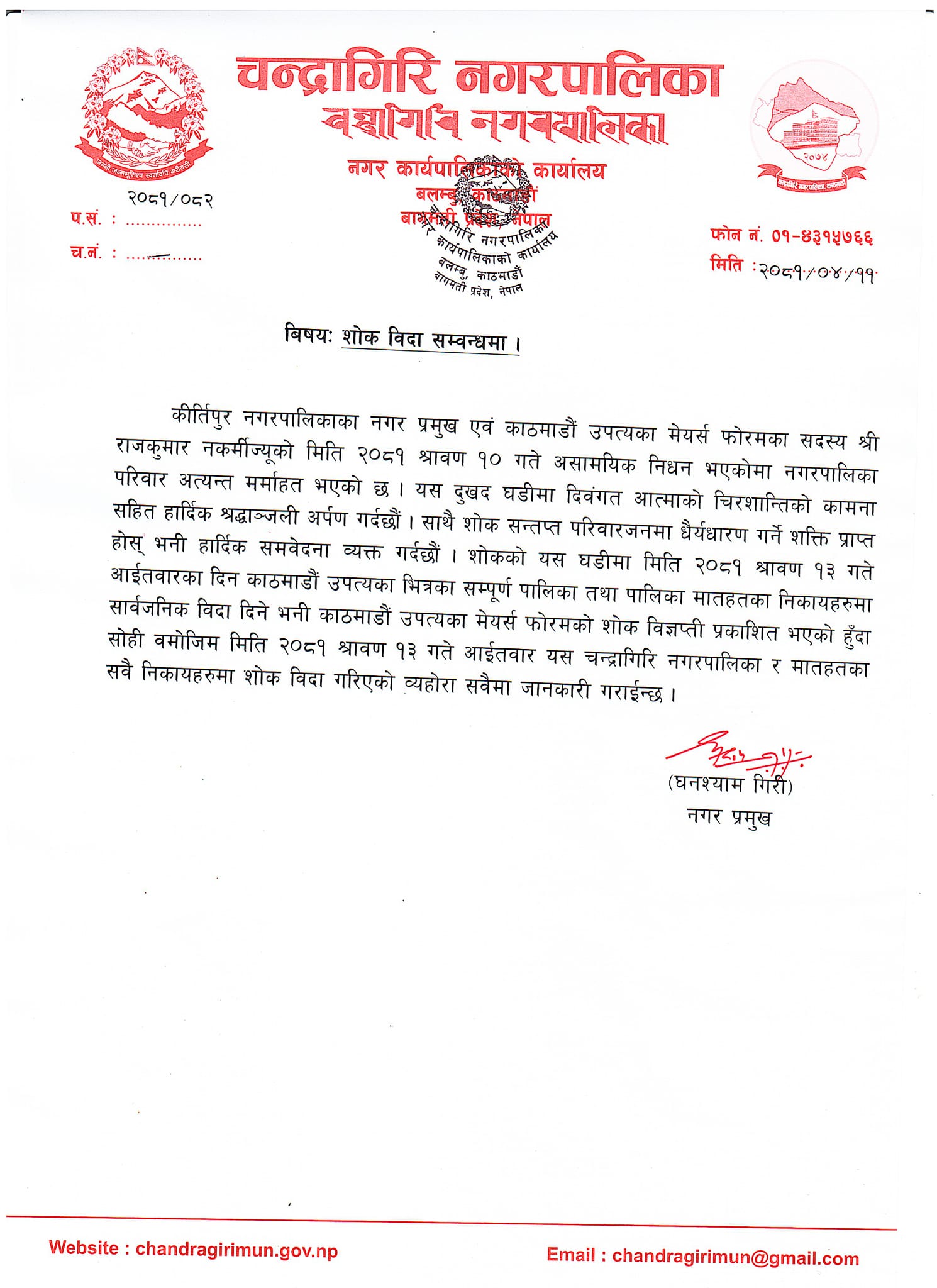 गत बिहीबार कीर्तिपुर नगरका मेयर राजकुमार नकर्मीको निधन भएको शोकमा आज चन्द्रागिरिसहित काठमाडाैं उपत्यकाका स्थानीय तहहरूले आज शोक बिदा दिएका छन् ।