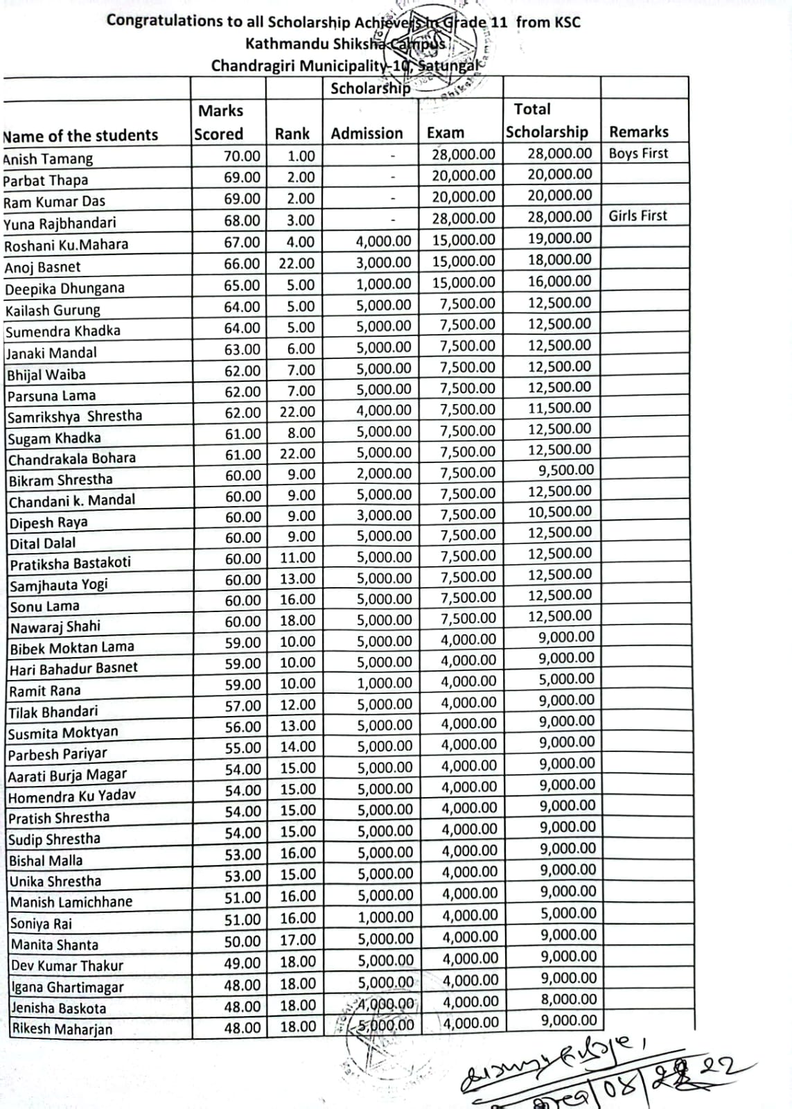 काठमाडाैं शिक्षा क्याम्पसको कक्षा ११ मा भर्ना हुने विद्यार्थीहरूले पाएको छात्रवृत्तिको विवरण हेराैंः