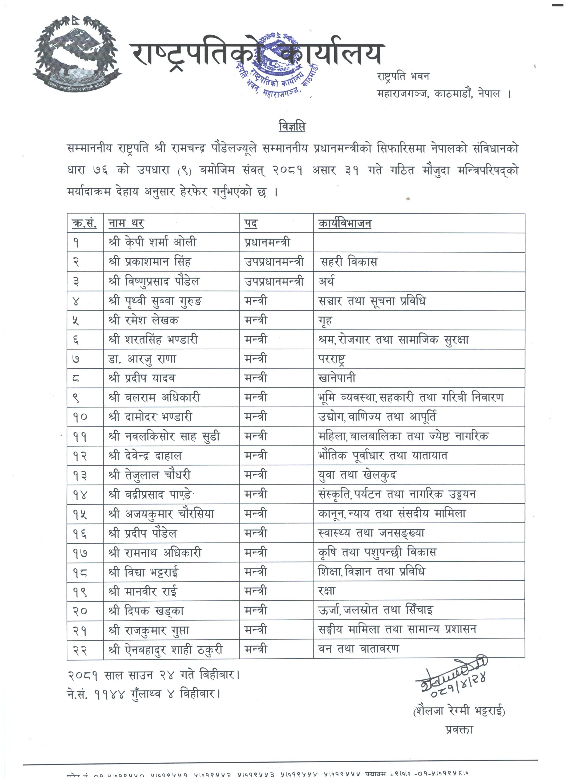 प्रधानमन्त्री केपी शर्मा ओलीको सिफारिसमा राष्ट्रपति पौडेलले मौजुदा मन्त्रिपरिषद्‍मा वरियता हेरफेर गरेका हुन् ।