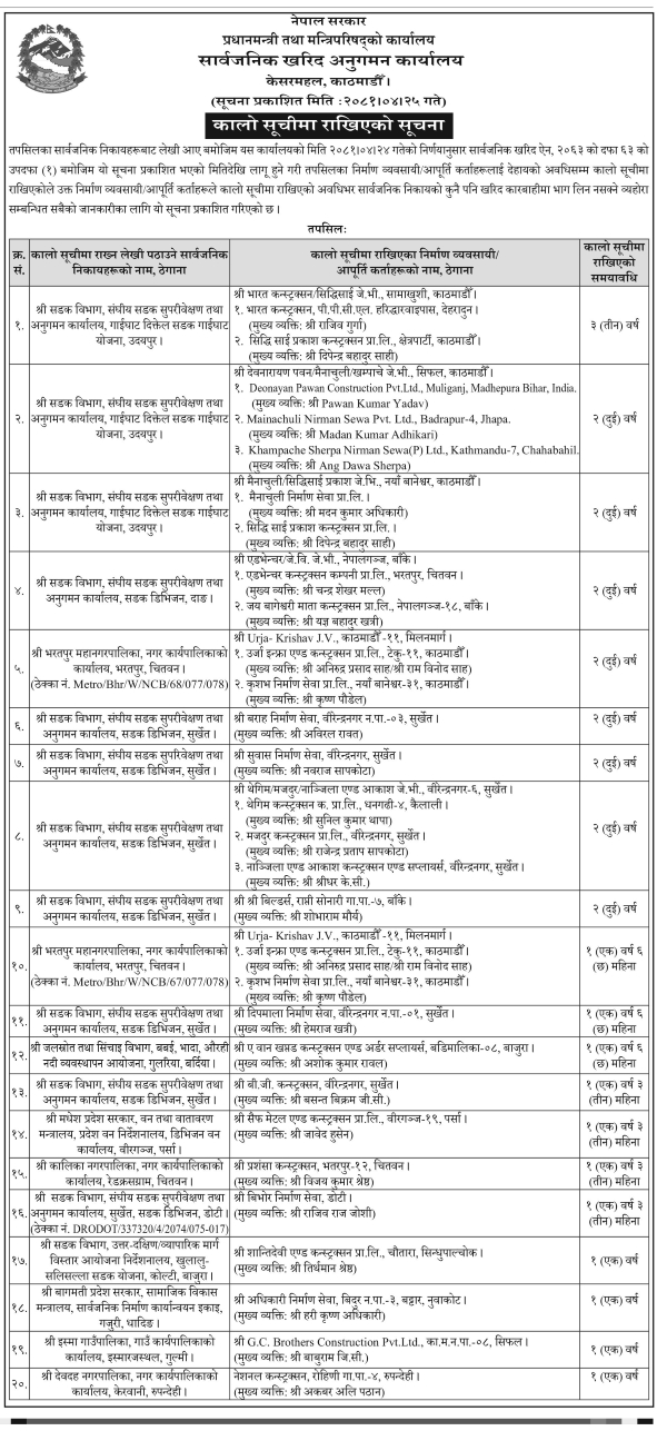 शुक्रबार सूचना प्रकाशित गर्दै कालोसूचीमा राखिएका निर्माण कम्पनी तथा व्यवसायीले कालोसूचीमा राखिएको अवधिभर कुनै पनि खरिद काराबाहीमा सहभागी हुन पाउने छैनन्।