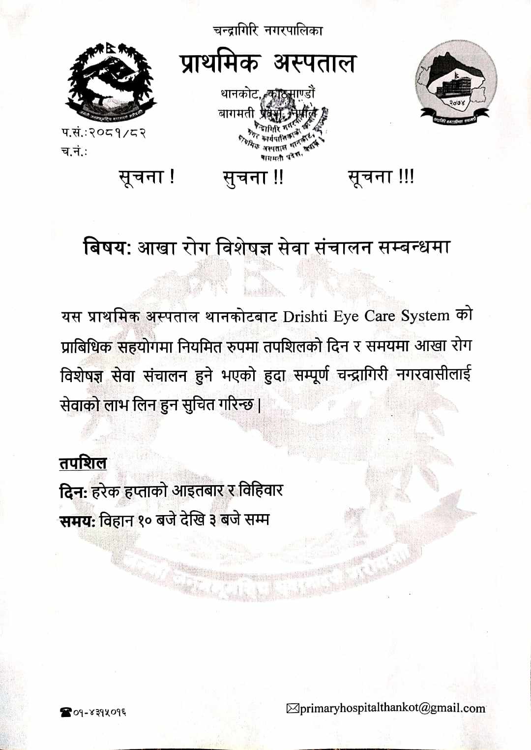 थानकोटस्थित नगर प्राथमिक अस्पतालमा अब हरेक आइतबार र बिहीबार आँखा रोग विशेषज्ञ सेवा उपलब्ध हुने भएको छ ।