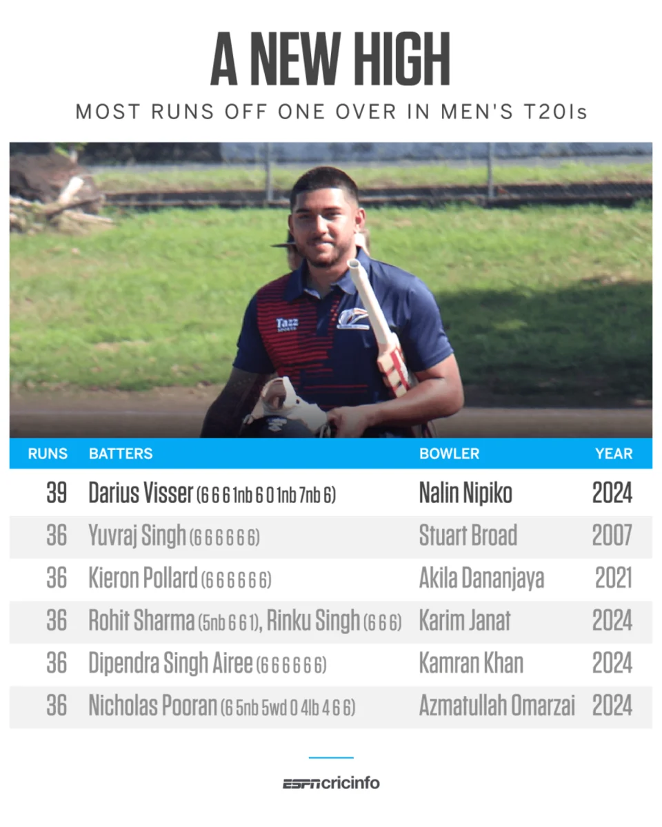 समोआका ड्यारियस भिसेरले पुरुष टी-२० अन्तर्राष्ट्रियको एकै ओभरमा सबैभन्दा बढी रन बनाउने कीर्तिमान तोड्दा समोआले एकै ओभरमा सर्वाधिक रन बनाउने कीर्तिमान समेत बनाउन सफल भयो।