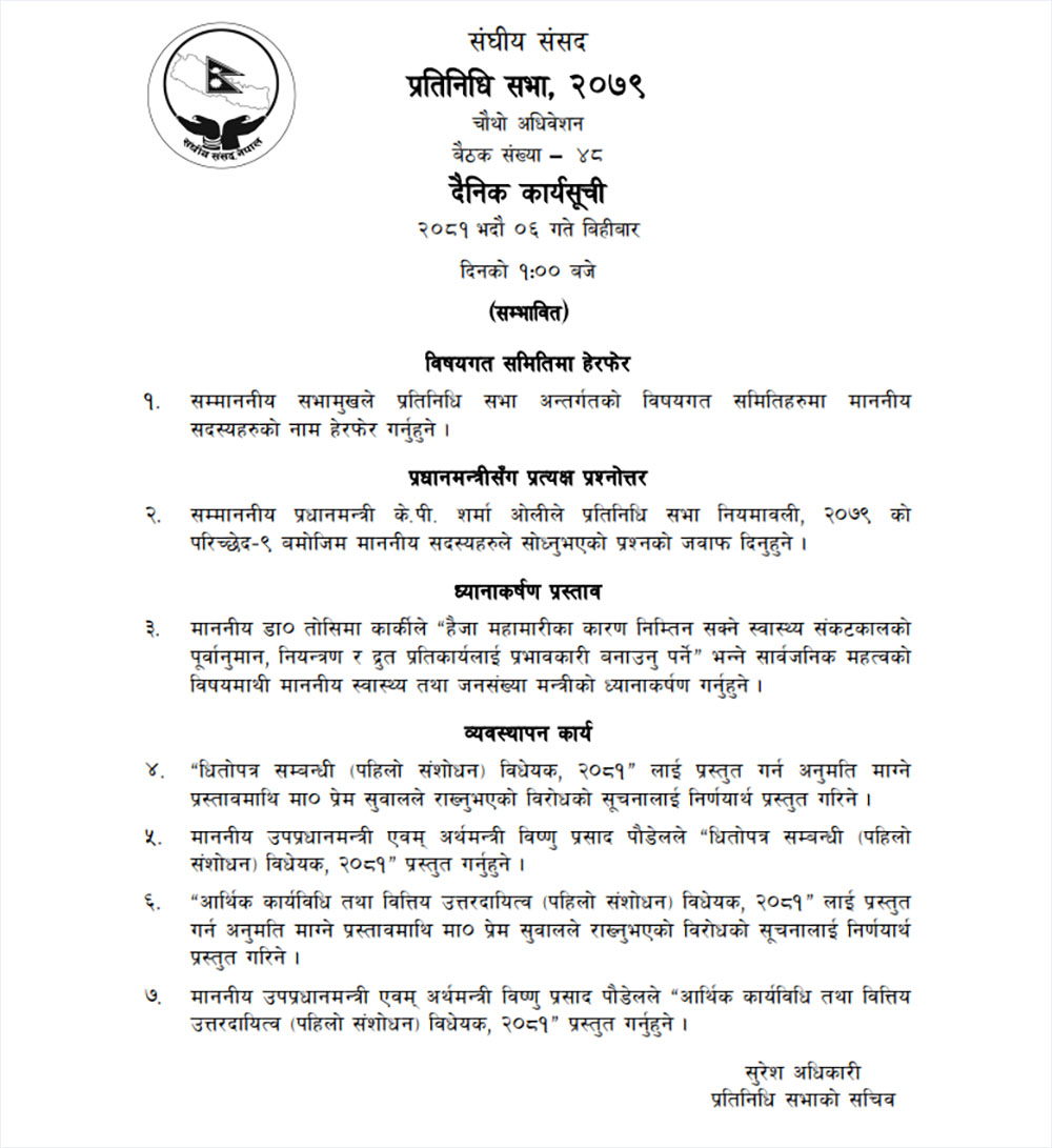 आजको बैठकमा प्रधानमन्त्रीसँग प्रत्यक्ष प्रश्नोत्तरको कार्यक्रम रहेको छ भने रास्वपा सांसद डा. तोसिमा कार्कीले हैजा महामारीका बारेमा स्वास्थ्यमन्त्रीको ध्यानाकर्षण प्रस्ताव राख्ने कार्यक्रम रहेको छ ।
