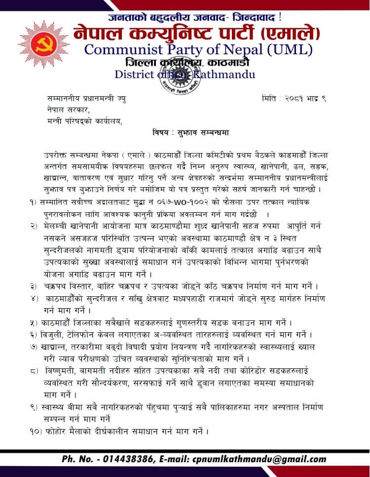 प्रधानमन्त्रीलाई नेकपा एमाले काठमाडौंको ध्यानाकर्षण