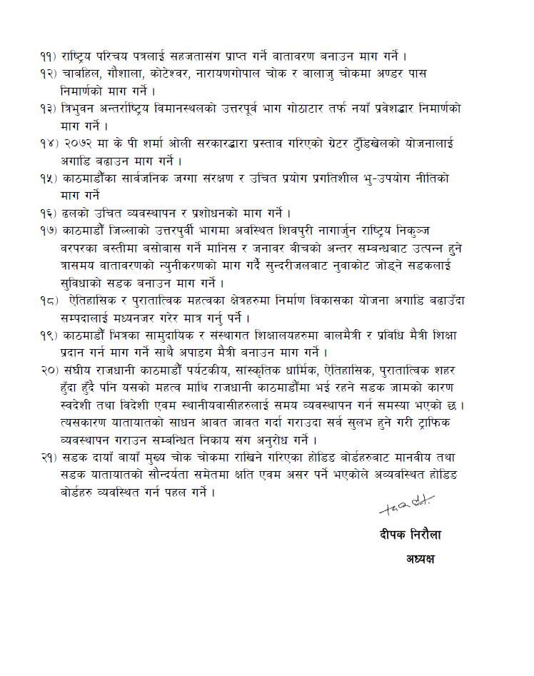 जिल्ला कमिटीले मेलम्ची खानेपानी आयोजनाको सहज आपूर्ति नभएको अवस्थामा सुन्दरीजलको नाग्मती ड्याम परियोजनाको बाँकी कामलाई तत्काल अगाडि बढाउन माग गरेको छ । उपत्यकाका विभिन्न भागमा पुनर्भरणको योजना अगाडि बढाउन पनि माग गरिएको छ ।
