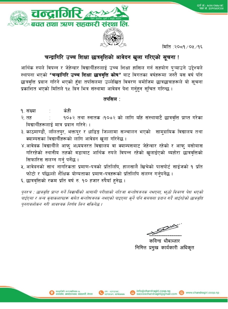चन्द्रागिरि साकोसले प्रदान गर्ने उच्च शिक्षा छात्रवृत्ति प्राप्तिका लागि आवेदन आह्वान