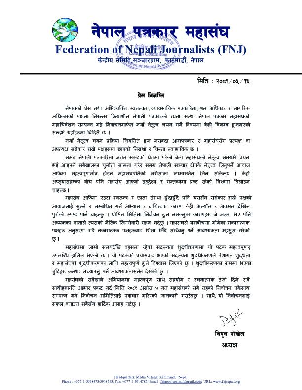 नयाँ नेतृत्व चयन प्रक्रिया नियमित हुन नसक्दा आमपत्रकार र महासंघसँग प्रत्यक्ष वा अप्रत्यक्ष सरोकार राख्ने पक्षहरूमा छाएको निराशा र चिन्ता स्वाभाविक रहेको पनि उनले स्वीकार गरेका छन्।