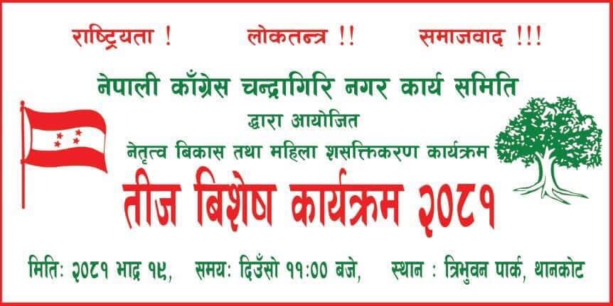 नेपाली काँग्रेस चन्द्रागिरि नगर कमिटिले आज त्रिभुवन पार्कमा तीज विशेष कार्यक्रम आयोजना गर्दै