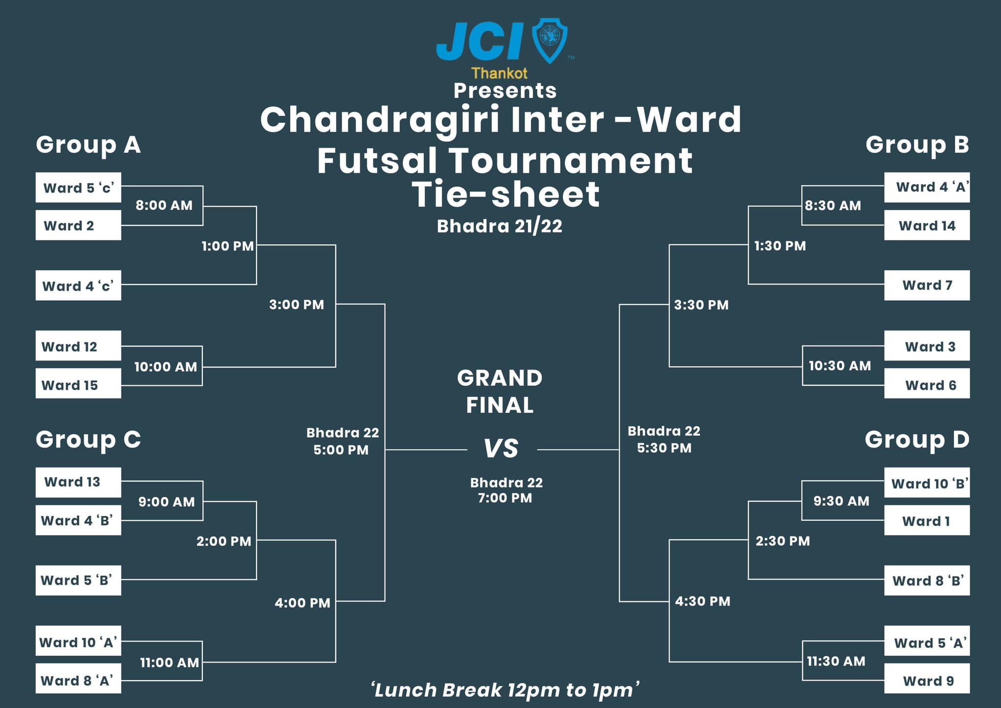 प्रतियोगिताको उद्घाटन खेल चन्द्रागिरि वडा नं. ५ को ग टिम र चन्द्रागिरि नगरपालिका वडा नं. २ टिमबीच हुनेछ ।