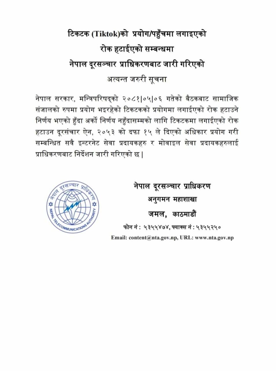 सरकारले औपचारिक रुपमै टिकटकमाथिको प्रतिबन्ध हटाएको छ । नेपाल दूरसञ्चार प्राधिकरणले सबै इन्टरनेट सेवा र मोबाइल सेवा प्रदायकलाई प्रतिबन्ध हटाउन औपचारिक सूचना निकालेसँगै टिकटक चल्न थालेको छ ।