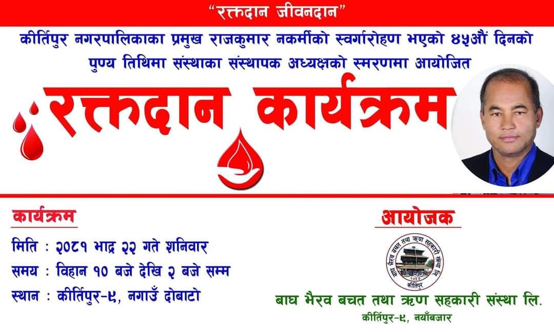 कीर्तिपुर नगरका दिवंगत मेयर राजकुमार नकर्मीको ४५औ दिनको पुण्य तिथिमा रक्तदान कार्यक्रम आयोजना गरिने भएको छ ।