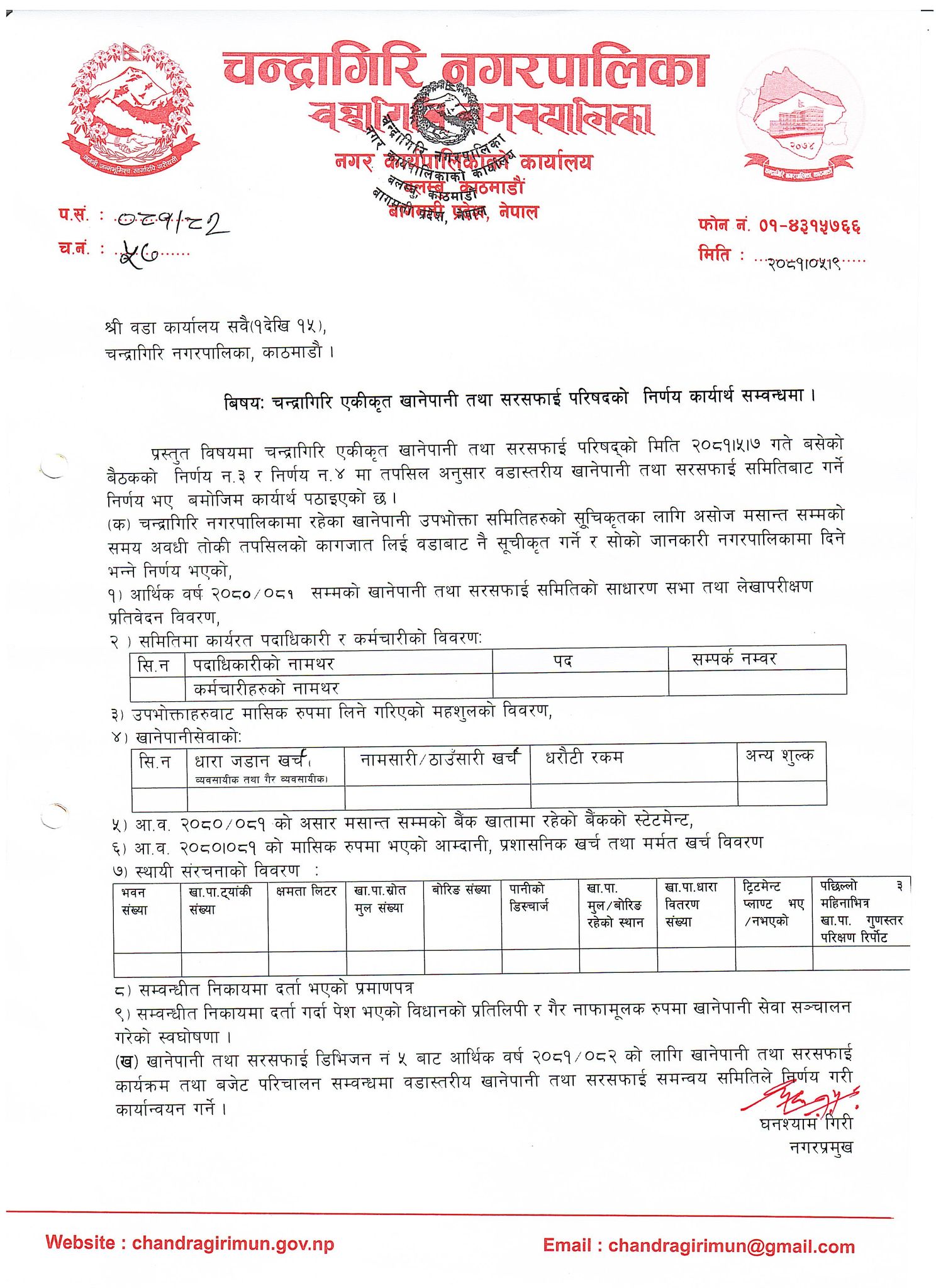 असोज मसान्तभित्र सूचीकृत भइसक्न खानेपानी उपभोक्ता समितिहरूलाई चन्द्रागिरि नगरको सूचना