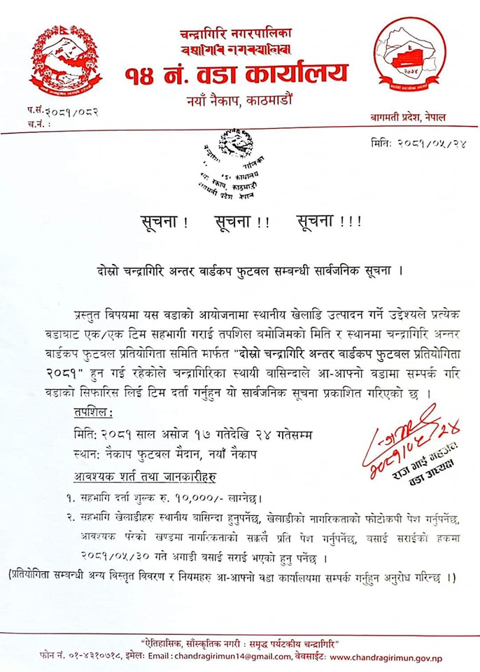 नैकापस्थित चन्द्रागिरि अन्तर वडा कप फुटबल प्रतियोगिता समितिको आयोजनामा हुने प्रतियोगिता असोज २४ गते सकिने चन्द्रागिरि नगरपालिका वडा नं. १४ का वडाध्यक्ष राजभाइ महर्जनले जानकारी दिनुभयो ।