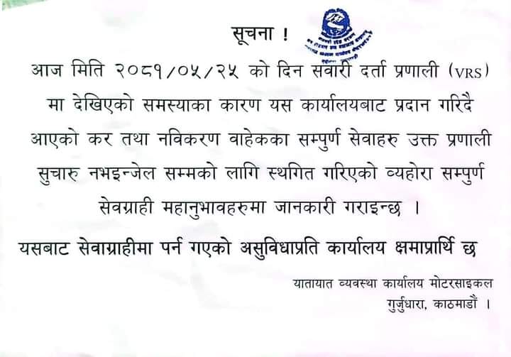 कार्यालयका अनुसार सवारी दर्ता प्रणाली (भीआरएस) मा देखिएको समस्याका कारण कर तथा नविकण बाहेकका अन्य सम्पूर्ण सेवा भीआएस सुचारु नहुँदासम्मका लागि स्थगित गरिएको हो ।