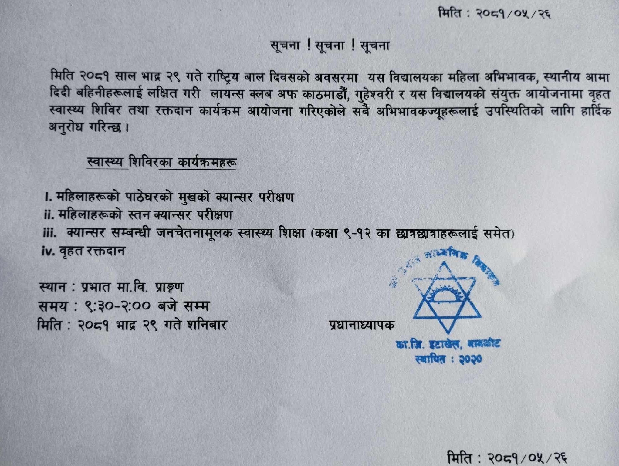सो विद्यालयका प्रधानाध्यापक गोविन्द प्रसाद रुपाखेतीका अनुसार लायन्स क्लब अब काठमाडाैं गुह्येश्वरी र विद्यालयको संयुक्त आयोजनामा महिलाहरूको लागि पाठेघरको मुखको क्यान्सर परीक्षण, महिलाहरूको स्तन क्यान्सर परीक्षण तथा क्यान्सर सम्बन्धी जनचेतनामूलक स्वास्थ्य शिक्षा कार्यक्रम सञ्चालन हुनेछ ।