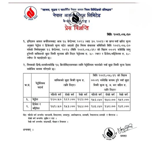 नेपाल आयल निगमले आज १२ बजेदेखि लागु हुनेगरी पेट्रोलमा प्रतिलिटर चार रुपैयाँ र डिजेलमा प्रतिलिटर ५ रुपैयाँ मूल्य घटाएको छ ।