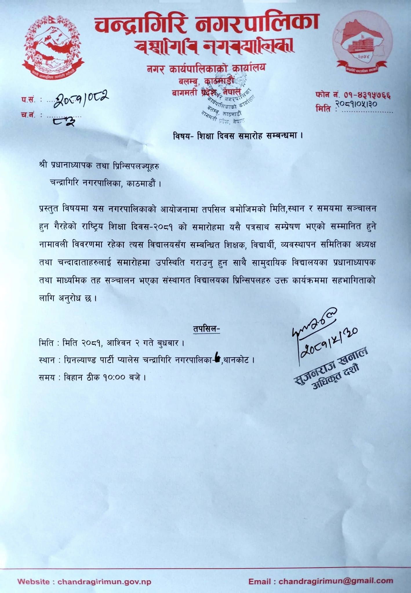 चन्द्रागिरि नगरको संयोजनमा चेकपोष्टस्थित ग्रिनल्याण्ड पार्टी प्यालेसमा आयोजना हुने सो कार्यक्रममा विभिन्न विद्यालयका शिक्षक, विद्यार्थी लगायतको सम्मान समेत गरिने चन्द्रागिरि नगरको शिक्षा, युवा तथा खेलकुद शाखाले जनाएको छ ।