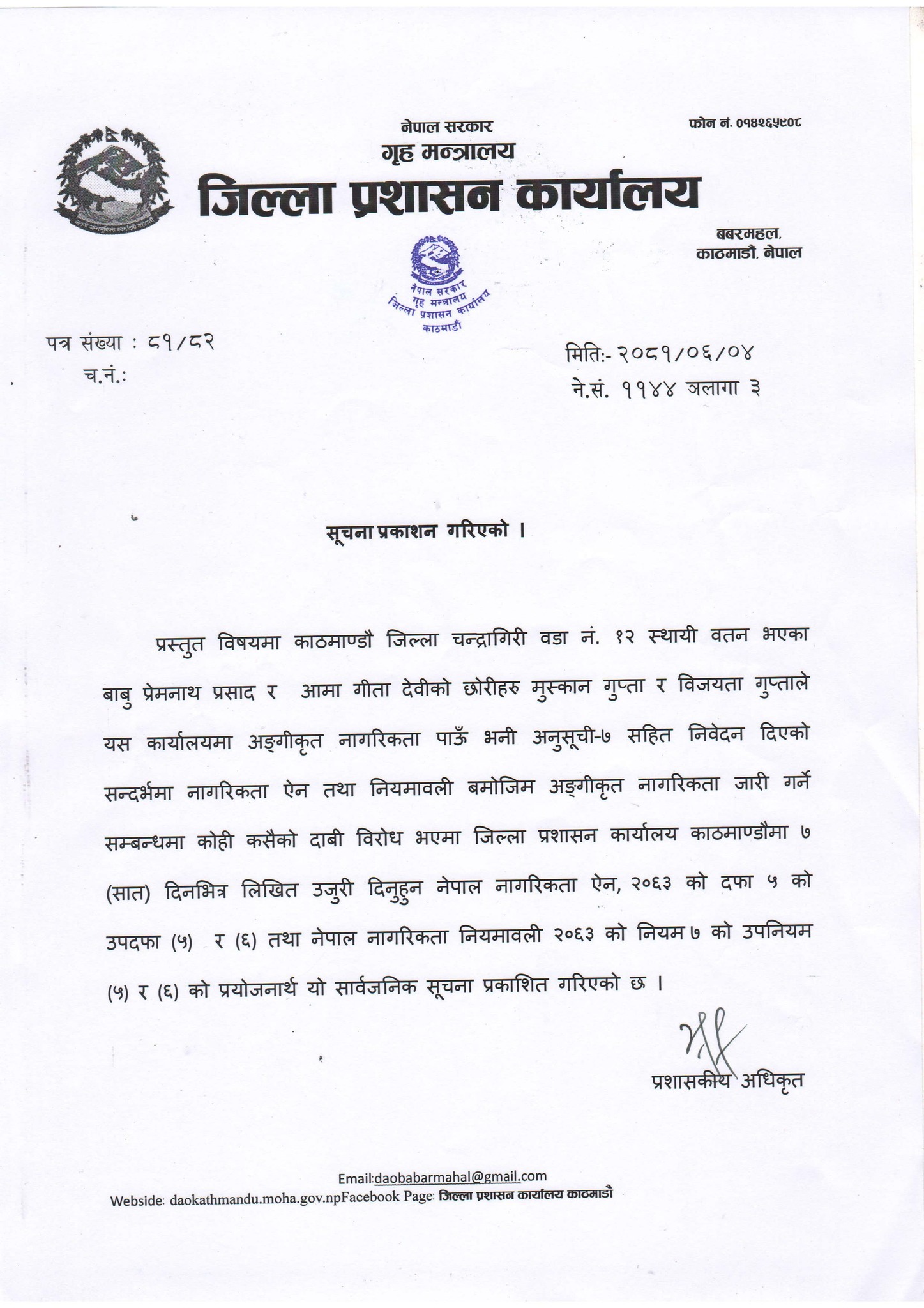 शुक्रबार एक सूचना जारी गर्दै कार्यालयले बलम्बु स्थायी वतन भएका प्रेमनाथ प्रसाद र गीतादेवीका छोरीहरू गुप्ता द्वयले अङ्गीकृत नागरिकता पाउँ भनी निवदेन दिएपछि नागरिकता ऐन तथा नियमावली बमोजीम अंगीकृत नागरिकता जारी गर्न सन्दर्भमा कोही कसैको दाबी विरोध भएमा सात दिनभित्र लिखित उजुरी दिन सूचना जारी गरेको हो ।