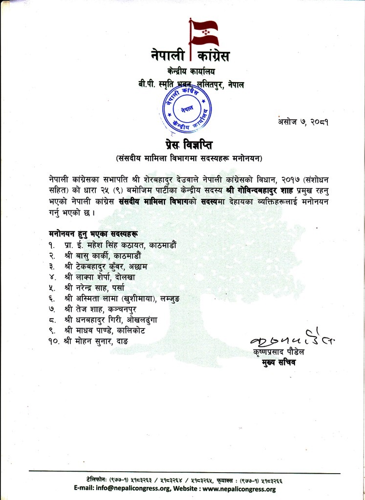 कांग्रेसको संसदीय मामिला विभागमा १० सदस्य मनोनित