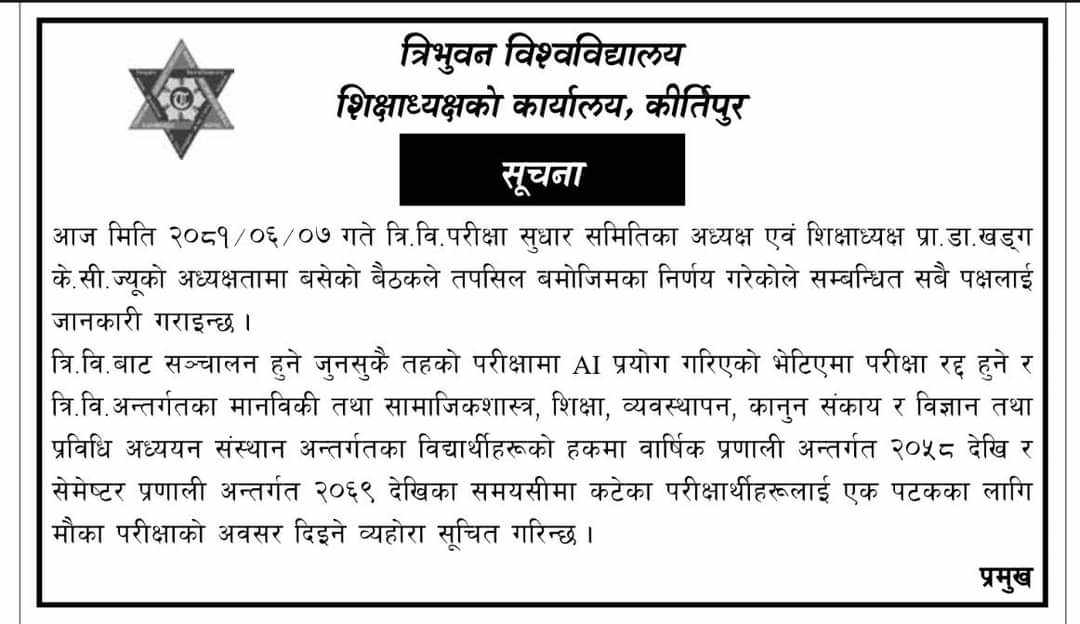 त्रिभुवन विश्वविद्यालयको जुनसुकै तहको परीक्षामा एआई प्रयोग गरेको भेटिएमा परीक्षा रद्द हुने भएको छ ।