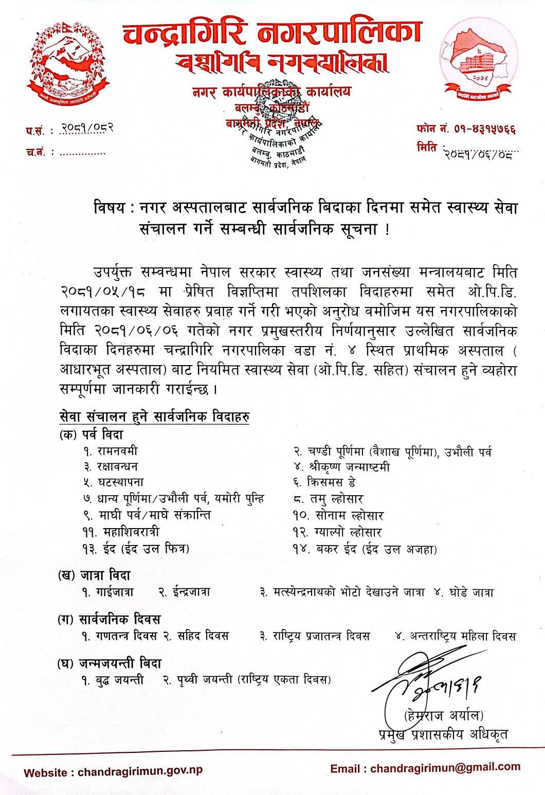 नेपाल सरकार स्वास्थ्य तथा जनसंख्या मन्त्रालयबाट प्रेषित विज्ञप्ती बमोजीम अस्पतालबाट उपलब्ध हुने ओपिडि लगायतका सेवाहरू असोज ६ गतेको चन्द्रागिरि नगर प्रमुख स्तरीय निर्णयानुसार सार्वजनिक बिदाका दिनमा समेत सुचारु रहने भएको हो ।