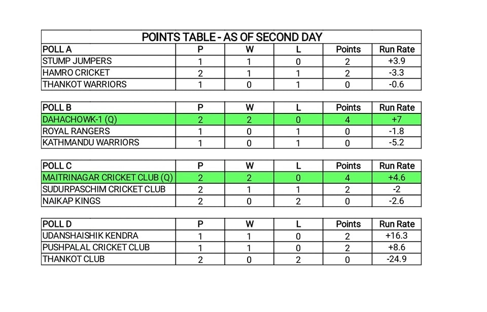 आज पुल ए मा रहेका स्टम्प जम्पर्स । थानकोट वारियर्स बीच खेल सम्पन्न भएपछि यो समुहबाट सेमीफाइनल पुग्ने टोलीको टुंगो लाग्नेछ ।