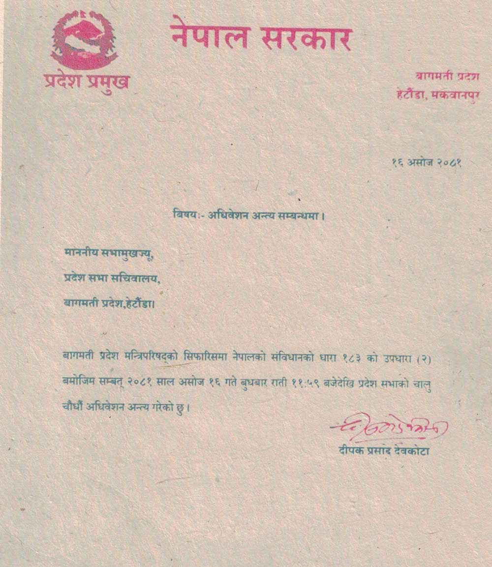 बागमती प्रदेश सरकारको सिफारिसमा प्रदेश प्रमुख दीपकप्रसाद दोवकोटाले संविधानको धारा १८३ को उपधारा २ बमोजिम प्रदेश अधिवेशन अन्त्य गरेको विज्ञप्तिमार्फत जानकारी गराएका छन् ।