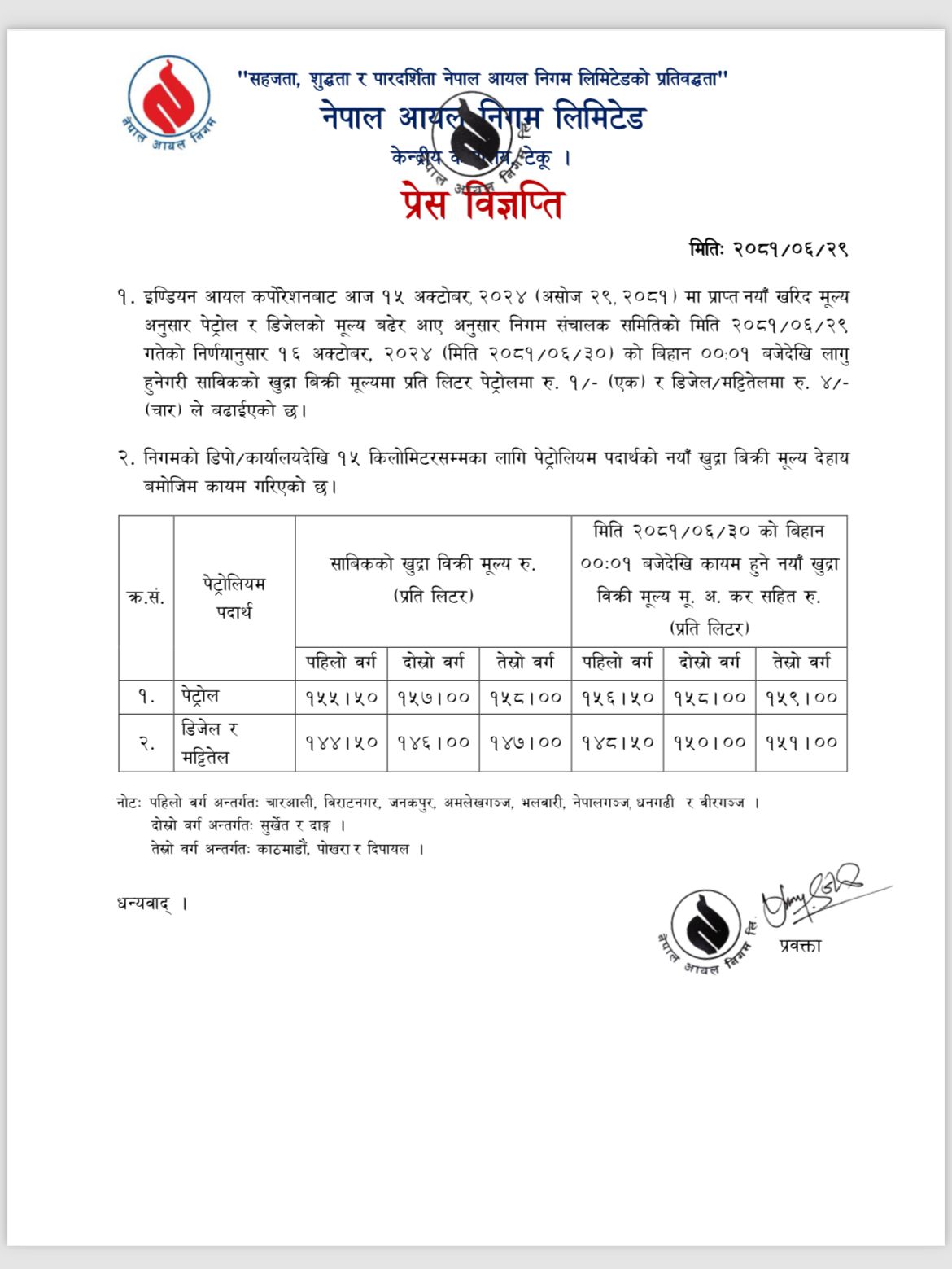 आज राति १२ बजेबाट लागु हुने गरी निगमले पेट्रोलको मूल्य प्रतिलिटर एक रुपैयाँ र डिजेल तथा मट्टीतेलको मूल्य प्रति लिटर ४ रुपैयाँले बढाएको हो ।