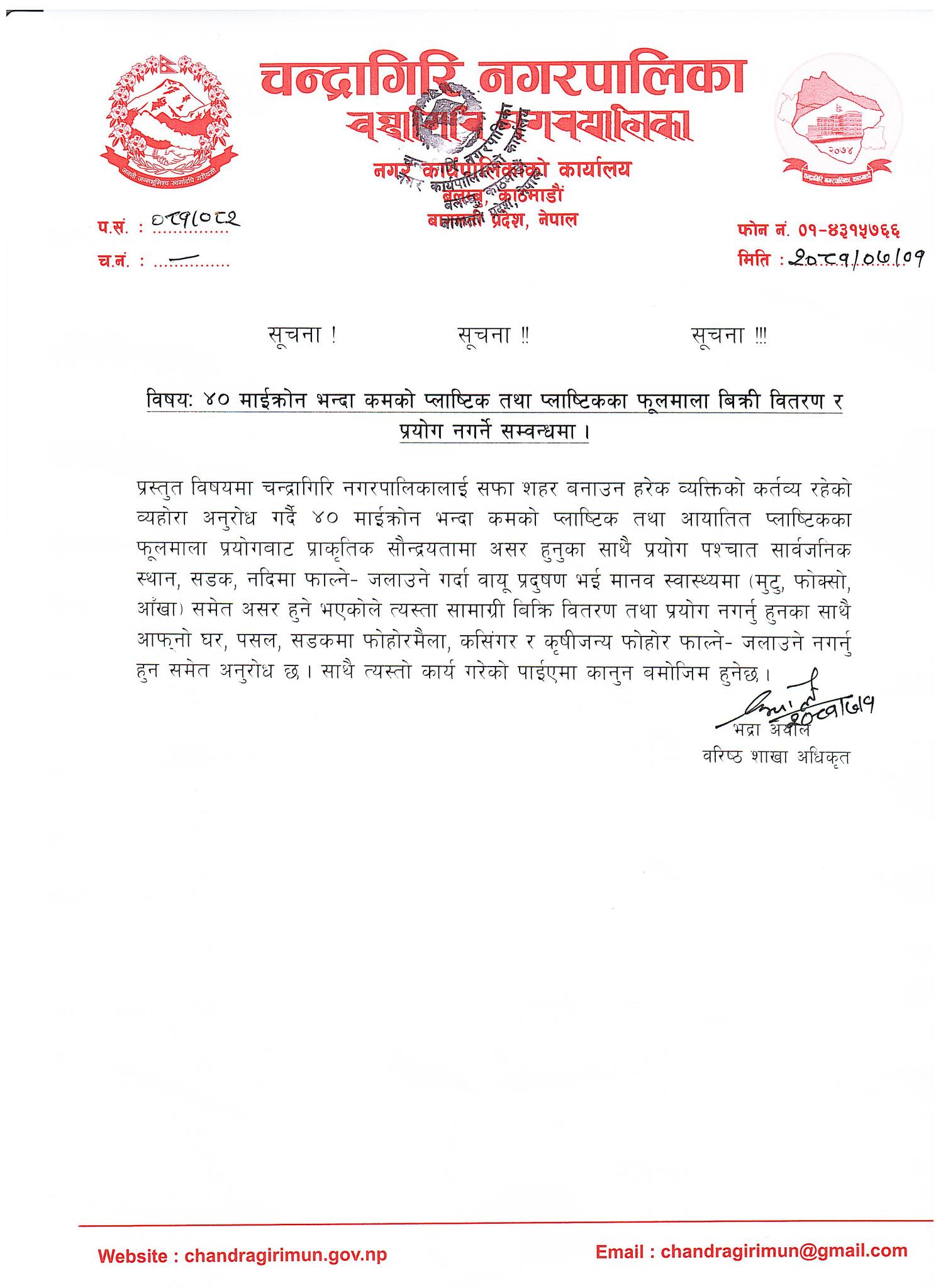 बिहीबार जारी भएको सूचनामा चन्द्रागिरि नगरपालिकालाई सफा शहर बनाउन हरेक व्यक्तिको कर्तव्य रहेको व्यहोरा अनुरोध गर्दै ४० माईक्रोन भन्दा कमको प्लाष्टिक तथा आयातित प्लाष्टिकका फूलमाला प्रयोगबाट प्राकृतिक सौन्दर्यतामा असर हुनुका साथै प्रयोगपश्चात सार्वजनिक स्थान, सडक, नदिमा फाल्ने जलाउने गर्दा वायू प्रदुषण भई मानव स्वास्थ्यमा (मुटु, फोक्सो, आँखा) समेत असर हुने भएकोले त्यस्ता सामाग्री बिक्री वितरण तथा प्रयोग नगर्न अनुरोध गरिएको हो ।