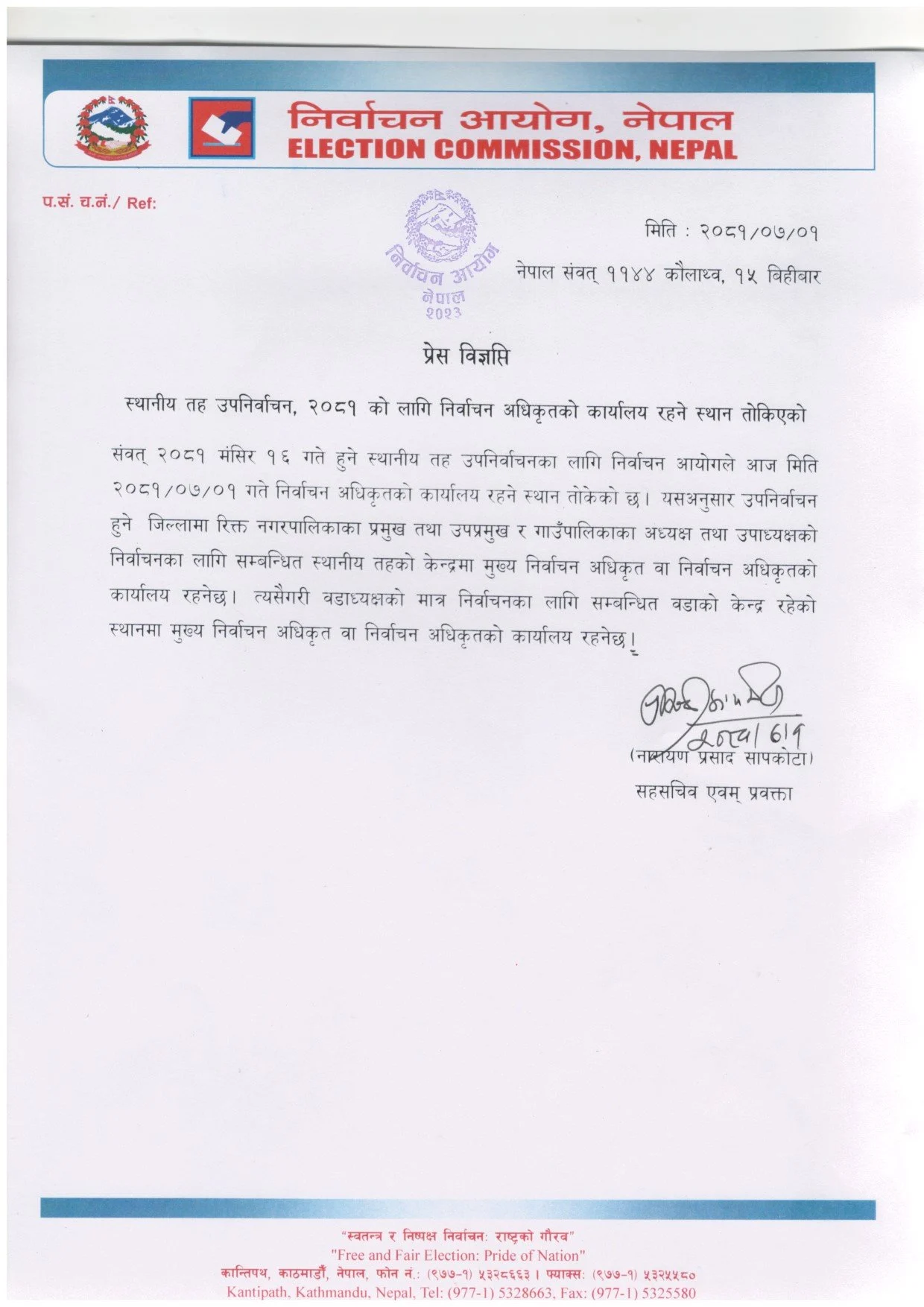 आयोगले बिहीबार विज्ञप्ति जारी गर्दै निर्वाचन अधिकृतको कार्यालय रहने स्थान तोकेको हो ।