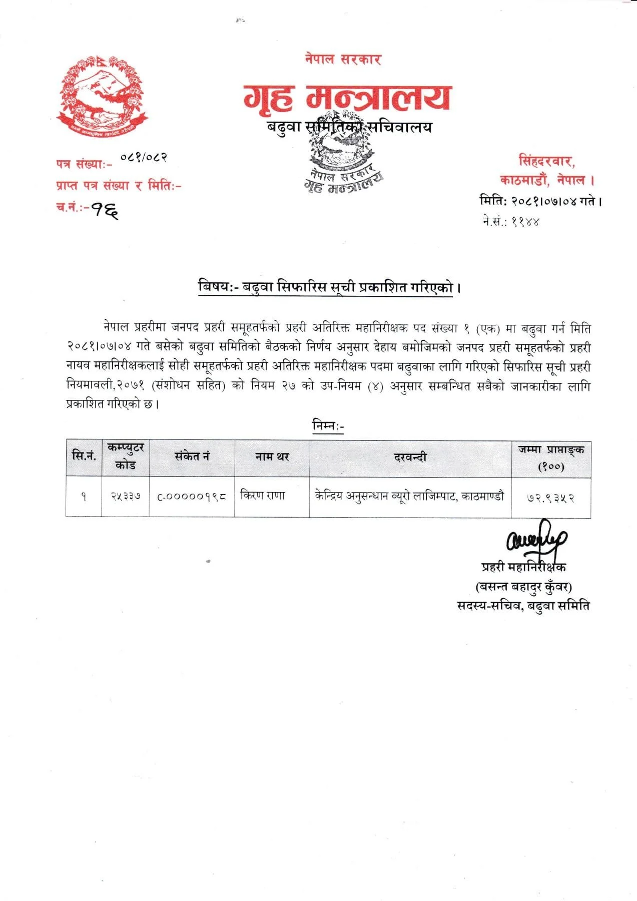 नेपाल प्रहरीका प्रहरी नायब महानिरीक्षक (डीआईजी) किरण राणा प्रहरी अतिरिक्त महानिरीक्षक (एआईजी)मा बढुवाका लागि सिफारिस भएकी छन् ।