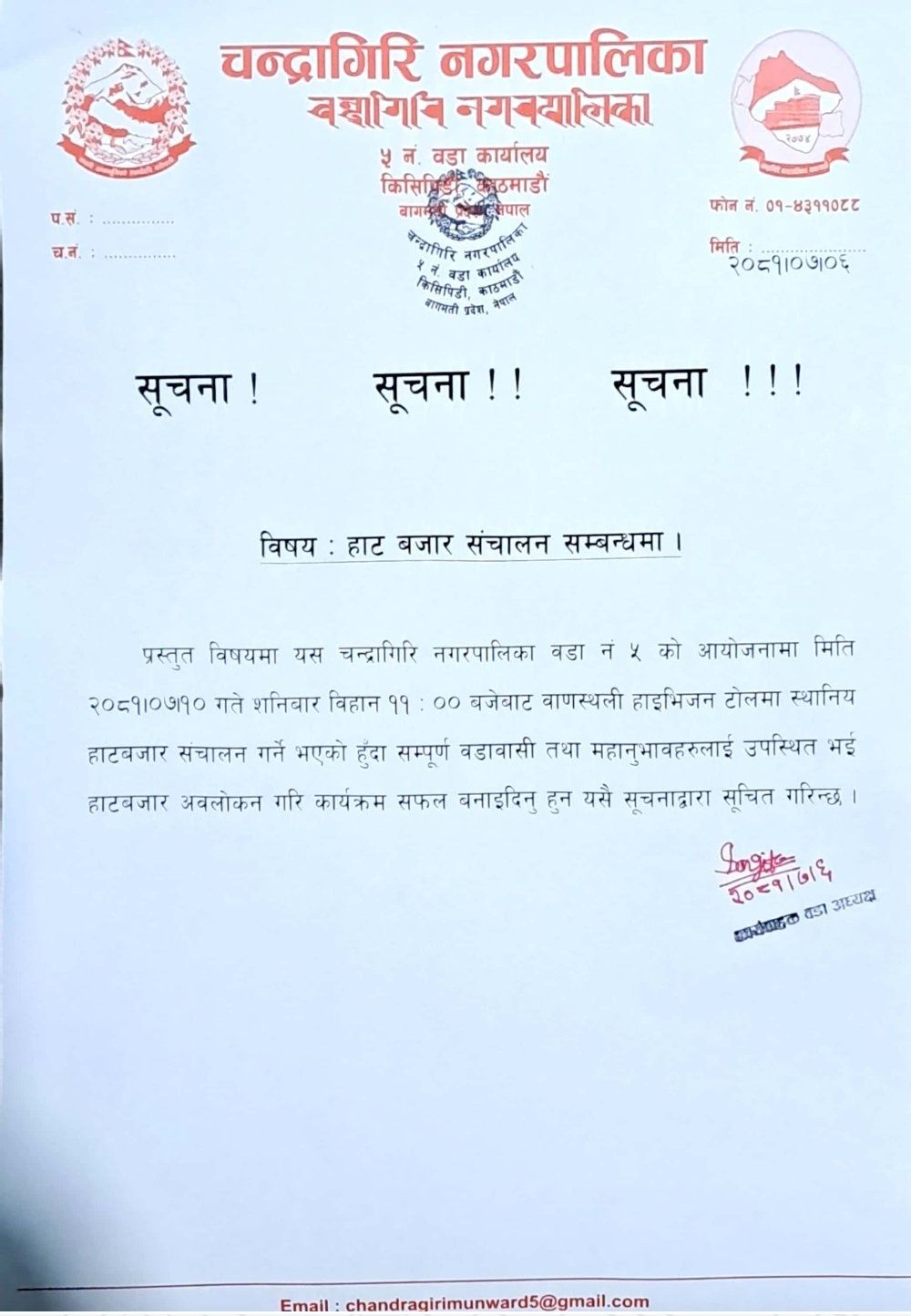 बजार बिहान ११ बजेबाट सुरु हुने चन्द्रागिरि नगरपालिका वडा नं. ५ को कार्यालयले जनाएको छ ।
