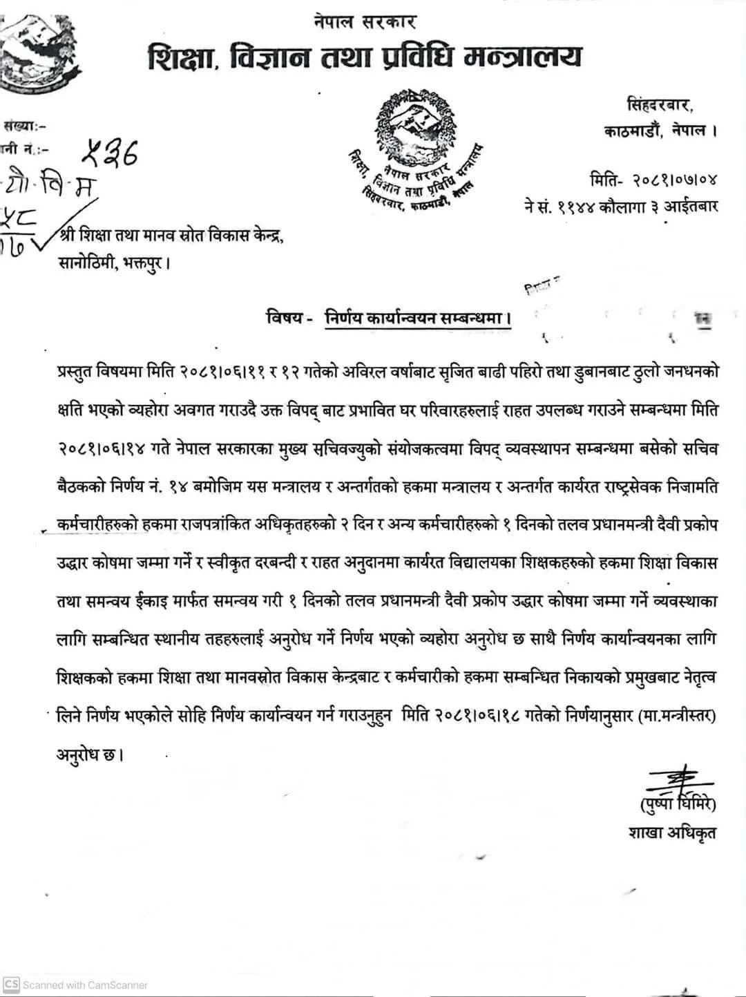 राष्ट्रसेवक निजामती कर्मचारीहरूको हकमा राजपत्रांकित अधिकृतहरूको २ दिन र अन्य कर्मचारीहरूको १ दिनको तलब प्रधानमन्त्री दैवी प्रकोप उद्धार कोषमा जम्मा गर्ने निर्णय गरिएको थियो । सोही आधारमा स्वीकृत दरबन्दी र राहत अनुदानमा कार्यरत विद्यालयका शिक्षकहरूको १ दिनको तलब कोषमा जम्मा गर्न भनेको हो ।