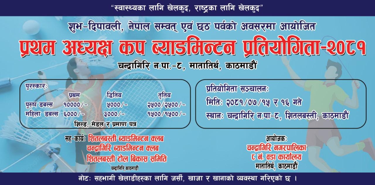 चन्द्रागिरि नगरपालिका वडा नं ८ को आयोजनामा र शितलबस्ती ब्याडमिन्टन क्लब एवं चन्द्रागिरि ब्याडमिन्टन क्लब र शितलबस्ती टोल विकास समितिको सहकार्यमा प्रथम अध्यक्ष कप ब्याडमिन्टन प्रतियोगिता आयोजना हुन लागेको हो।
