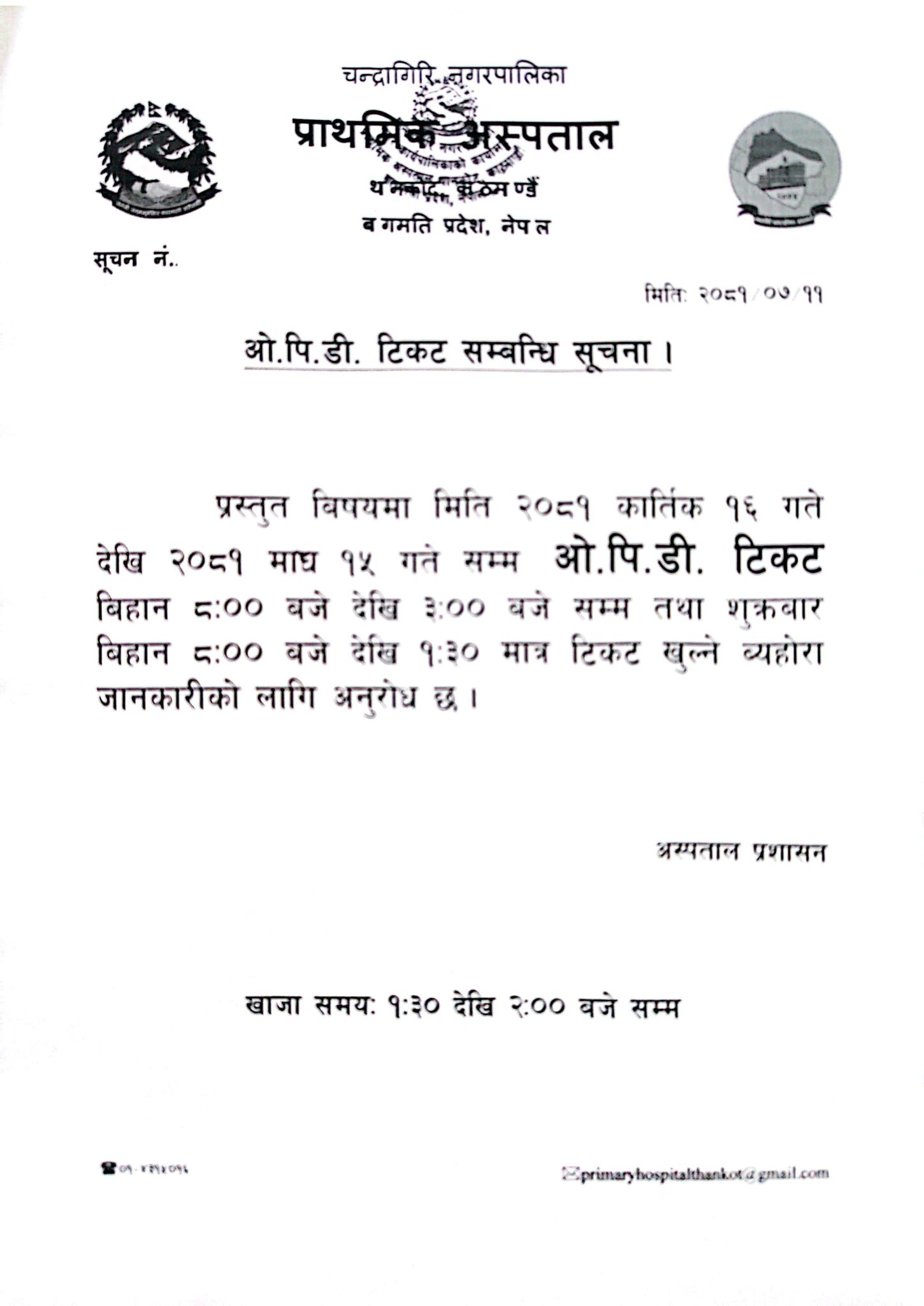चन्द्रागिरि नगरपालिका-४ थानकोटमा रहेको नगर प्राथमिक अस्पतालमा सञ्चालनमा रहेको बहिरंग सेवाको समय हेरफेर गरिएको छ ।