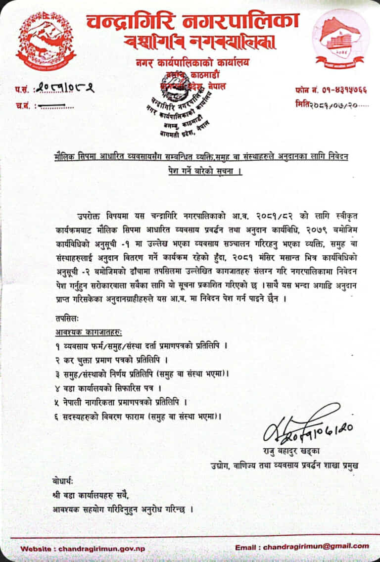 चन्द्रागिरि नगरपालिकाले माैलिक सिपमा आधारित विभिन्न व्यवसायमा संलग्न संस्था तथा व्यक्तिहरूलाई अनुदान वितरण गर्ने भएको छ ।