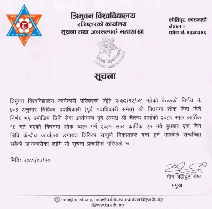 त्रिभुवन विश्वविद्यालयमा आज बुधबार शोक बिदा, त्रिविका सम्पूर्ण निकायहरू बन्द रहने