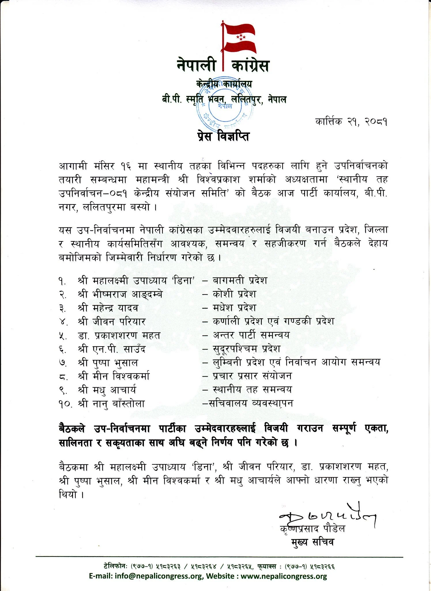 कांग्रेस केन्द्रीय पार्टी कार्यालयका मुख्य सचिव कृष्णप्रसाद पौडेलले बैठकले उपनिर्वाचनमा कांग्रेसका उम्मेदवारलाई विजयी बनाउन प्रदेश, जिल्ला र स्थानीय कार्यसमितिसँग आवश्यक, समन्वय र सहजीकरण गर्न बैठकले  जिम्मेवारी तोकेको बताए । उनका अनुसार बैठकले महालक्ष्मी उपाध्याय ‘डिना’ बागमती प्रदेश, भीष्मराज आङ्दम्बे कोशी प्रदेश, महेन्द्र यादव मधेस प्रदेश, जीवन परियार कर्णाली प्रदेश र गण्डकी प्रदेश, डा. प्रकाशशरण महत अन्तर पार्टी समन्वय, एनपी साउँद सुदूरपश्चिम प्रदेश, पुष्पा भुसाल लुम्बिनी प्रदेश एवं निर्वाचन आयोग समन्वय, मीन विश्वकर्मा प्रचार प्रसार संयोजन, मधु आचार्य स्थानीय तह समन्वय र नानु बाँस्तोलालाई सचिवालय व्यवस्थापनको जिम्मेवारी तोकेको छ ।