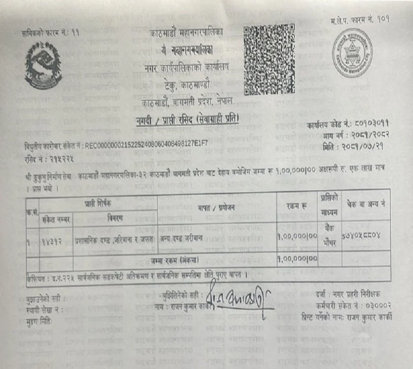 काठमाडौँ महानगरपालिले सडकमा निर्माण सामग्री राख्ने निर्माण सेवा कम्पनीमाथि जरिवाना असुल गरेको छ ।
