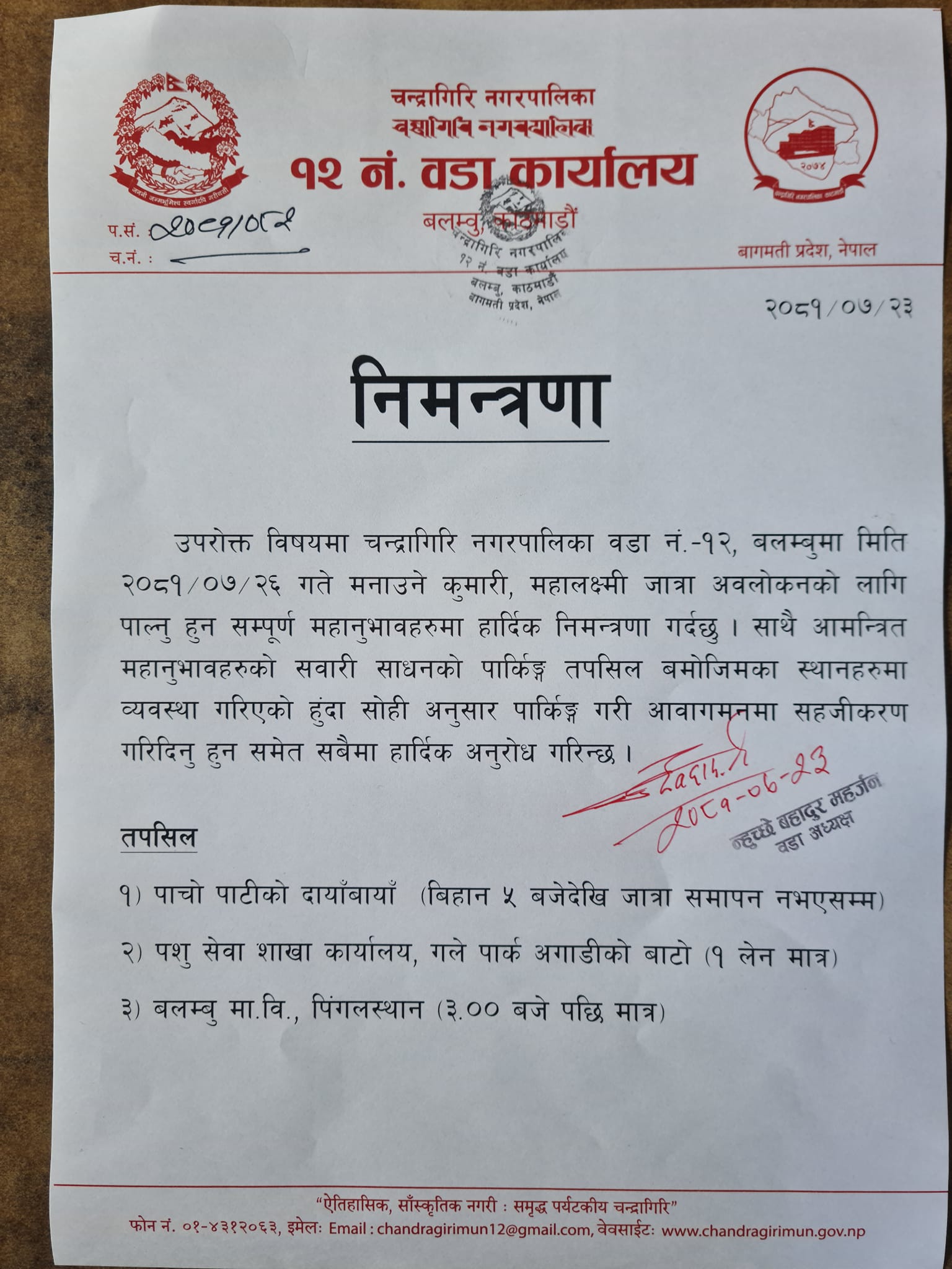 चन्द्रागिरि नगरपालिका वडा नं. १२ बलम्बुले बलम्बु क्षेत्रमा मनाइने महालक्ष्मी जात्रा र कुमारी जात्राका अवसरमा हिजो र आज (कार्तिक २५ र २६ गते) स्थानीय बिदा दिने निर्णय गरिसकेको छ ।