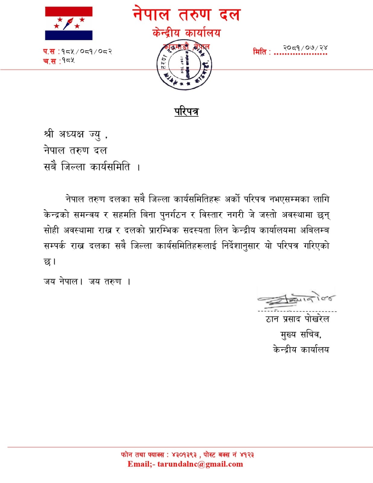 ‘तरूण दलका सबै जिल्लाका कार्यसमितिहरू अर्को परिपत्र नभएसम्मका लागि केन्द्रको समन्वय सहमतिबिना पुनर्गठन र विस्तार नगरी जेजस्तो अवस्थामा छन् सोही अवस्थामा राख्न र दलको प्रारम्भिक सदस्यता लिन केन्द्रीय कार्यालयमा सम्पर्क राख्न’ भन्दै परिपत्र गरिएको हो।