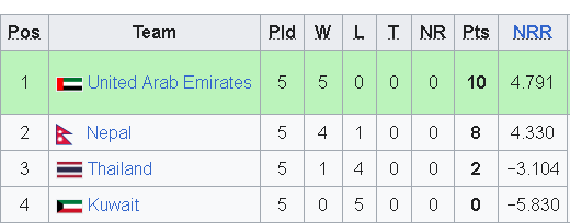 पाँच खेल खेल्दा एक हार र चार जितसहित नेपालले ८ अङ्क जोडेको छ। युएईले भने पाँच खेलमा सबै जित निकाल्दै १० अङ्क जोडेको छ। थाइल्याण्डले दुई अंक जोडेको छ भने कुवेत अङ्कविहीन छ।