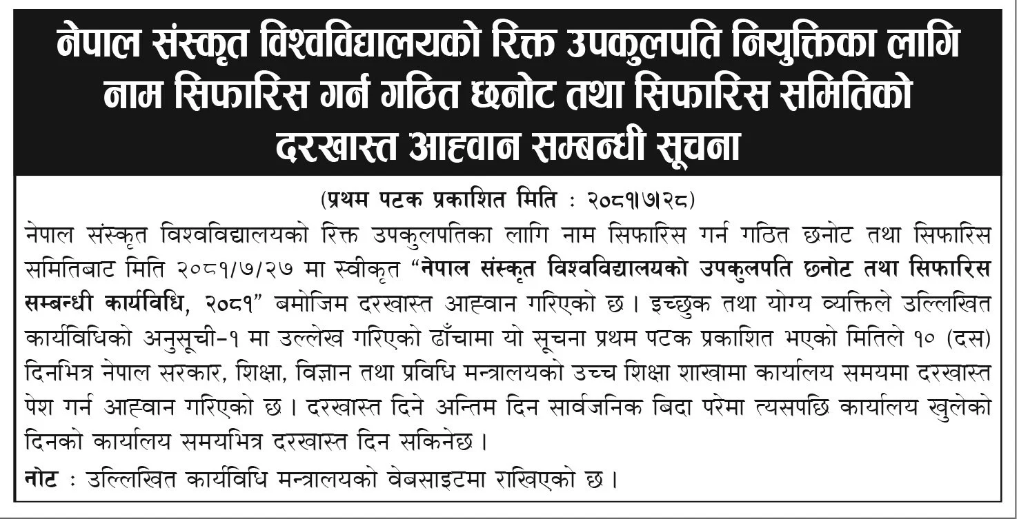 नेपाल संस्कृत विश्वविद्यालयको उपकुलपति छनोट तथा सिफारिस सम्बन्धी कार्यविधि, २०८१’ बमोजिम दरखास्त आह्वान गरिएको हो ।