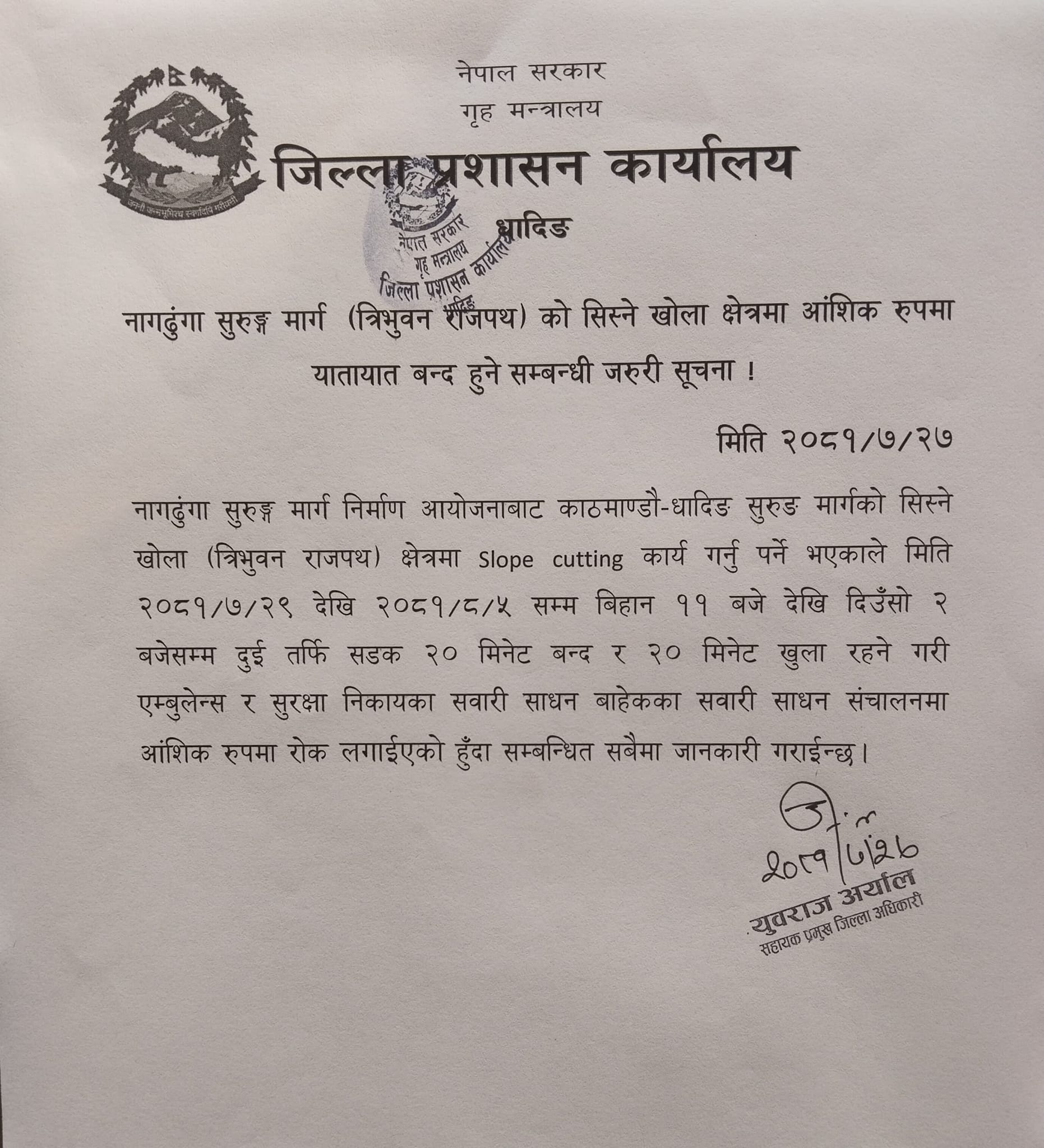 नागढुङ्गा सुरुङमार्गको सिस्ने खोला क्षेत्रमा स्लोप कटिङ कार्य गर्नुपर्ने भएकाले (आज) कात्तिक २९ देखि मंसिर ५ गतेसम्म बिहान ११ बजेदेखि दिउँसो २ बजेसम्म दुईतर्फी सडक आशिंक रूपमा बन्द हुन लागेको जिल्ला प्रशासन कार्यालय धादिङले जनाएको छ ।