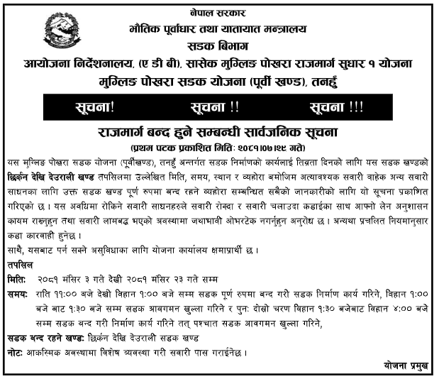 मंसिर ३ गतेदेखि २३ गतेसम्म सडक बन्द गरेर काम गर्ने सूचना जारी गरिएको छ। राति ११ बजेदेखी विहान १ बजेसम्म सडक पूर्ण रुपमा बन्द गरी सडक निर्माणको काम गरिने सूचना उल्लेख छ। विहान १ बजेदेखि साढे १ बजेसम्म सडक आवगमन खुल्ला गरिनेछ। यस्तै, दोस्रो चरणमा विहान साढे १ बजेबाट ४ बजेसम्म सडक बन्द गरी सडक निर्माण हुनेछ। त्यसपछि दिनैभर सडक पूर्ण रुपमा सूचारु हुनेछ।