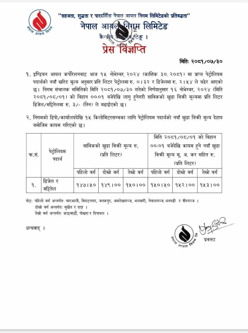 नेपाल आयल निगमले डिजेल र मट्टितेलको मूल्य बढाएको छ ।