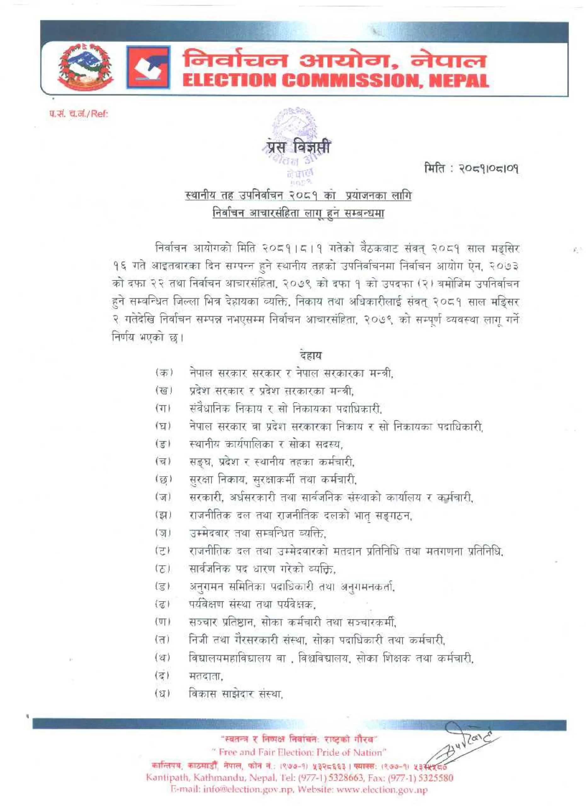 आसन्न उपनिर्वाचनका निम्ति आजदेखि आचारसंहिता लागु भएको छ ।