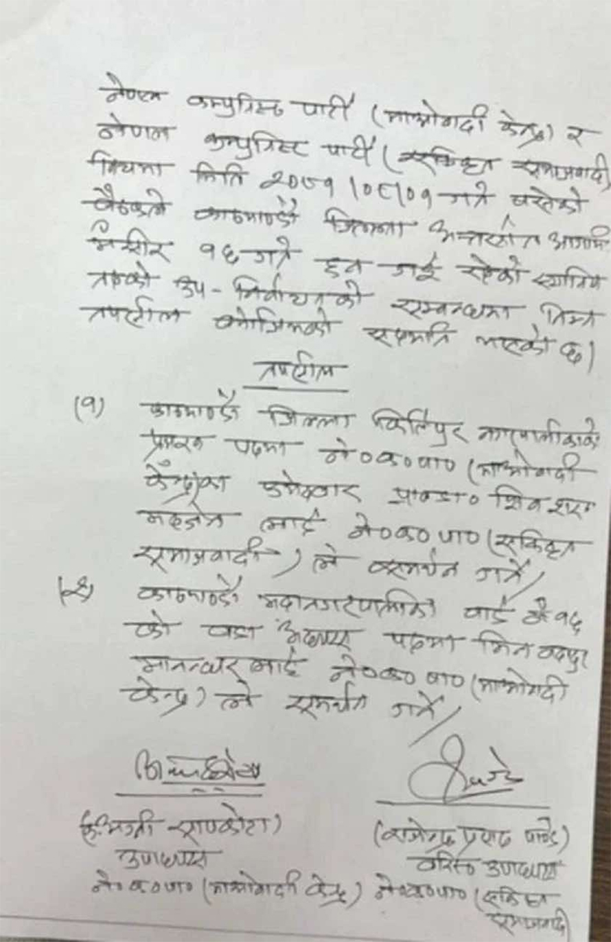 सहमति अनुसार काठमाडौंको कीर्तिपुर नगरपालिकामा मेयर पदमा माओवादी उम्मेदवार प्रा.डा. शिवशरण महर्जनलाई एकीकृत समाजवादीले सघाउनेछ भने काठमाडौं महानगरपालिका-१६ को वडाध्यक्षमा एकीकृत समाजवादीका उम्मेदवार मीनबहादुर मानन्धरलाई माओवादी केन्द्रले सघाउनेछ ।