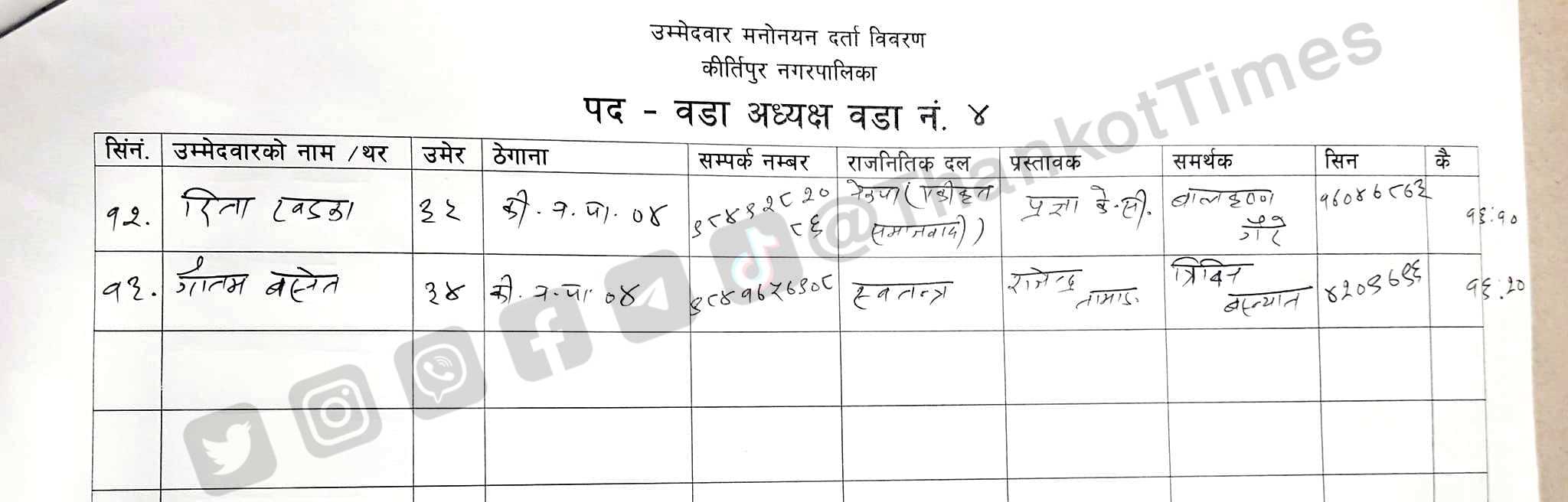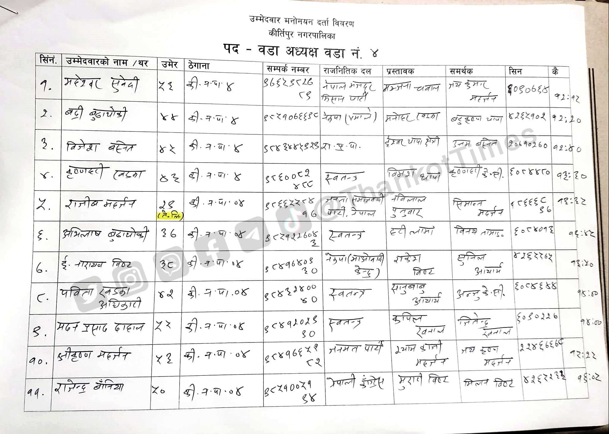 यस्तै कीर्तिपुर वडा नंं ४ को वडाध्यक्ष पदमा १२ जनाले उम्मेदवारी दिएका छन् ।